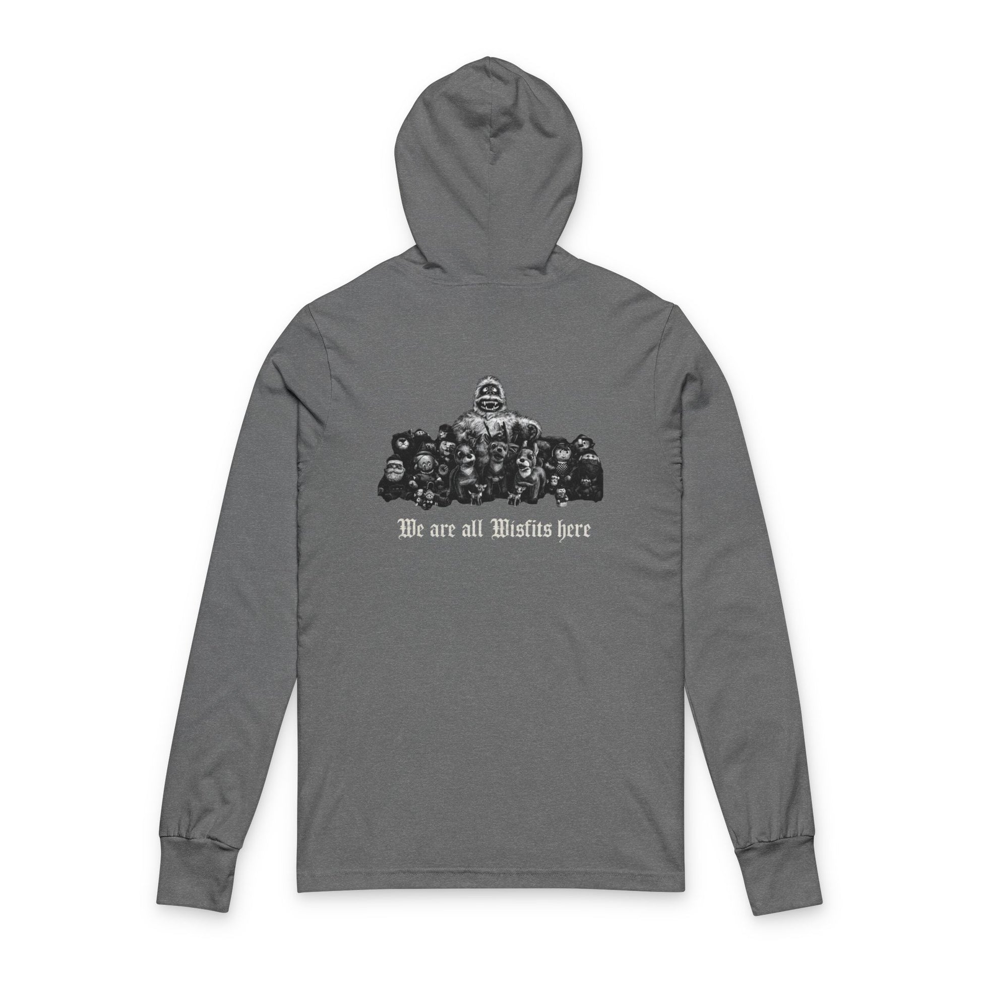A slim, hooded long-sleeve tee with a dark, vintage-inspired design that reads like a secret club emblem. The front features a curled banner bearing a hall name in distressed serif lettering. On the back a ghostly group portrait gathers beneath the words “We are all Misfits here,” giving the piece a quietly rebellious, camaraderie-driven vibe. Lightweight, breathable Airlume cotton keeps the fit soft and drapey while the hood and long sleeves add an extra layer for cool evenings. Wear it when you want something that feels like belonging to a late-night caravan or a hidden club—subtle, a little moody, and unmistakably personal.